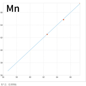 将锰硅合金已定值的生产样样品熔片在能量色散X射线荧光光谱仪中选定参数,输入样品成分数值,进行标定,建立标准曲线。校准样片的制备过程参考2小节。校准曲线如图2所示;